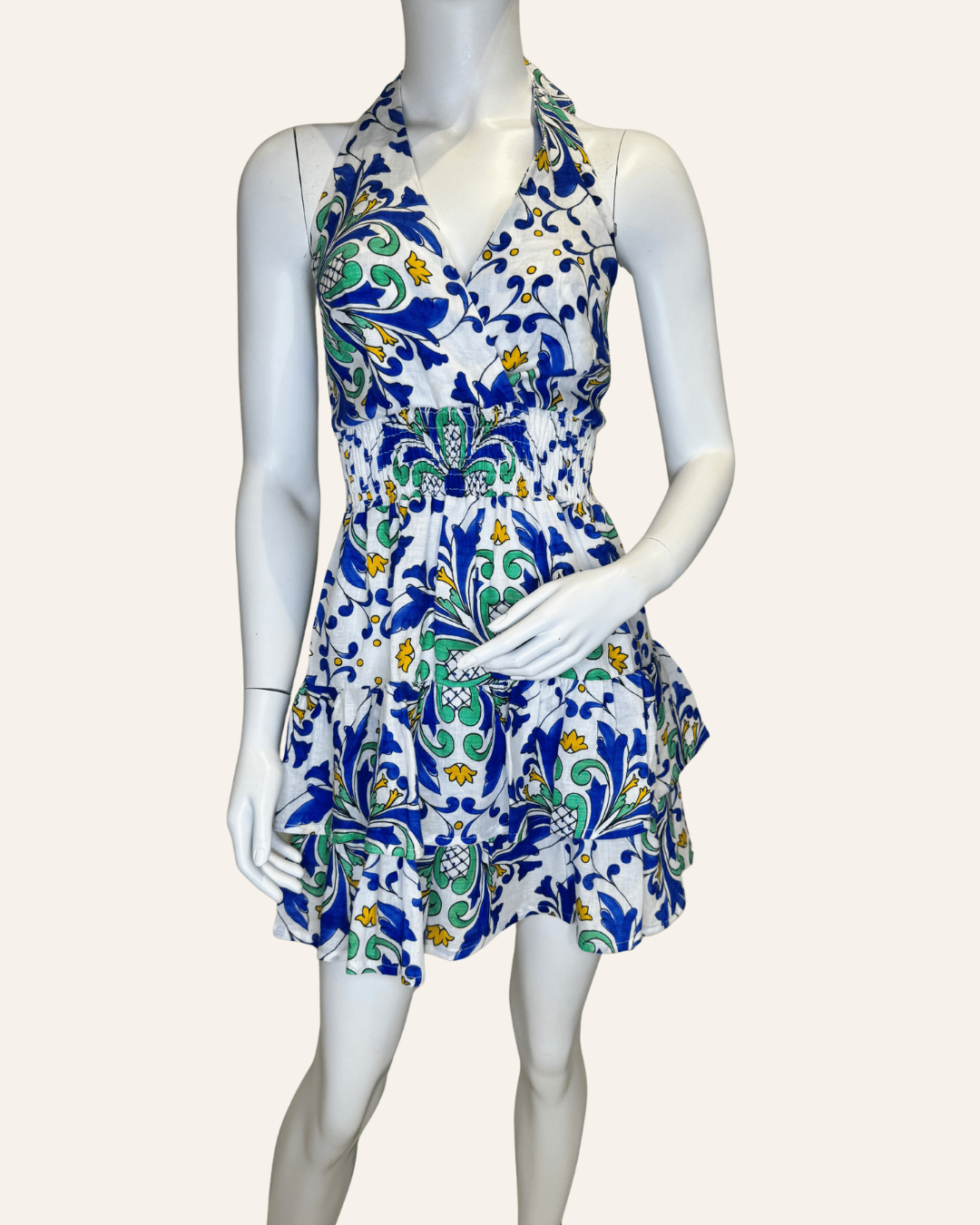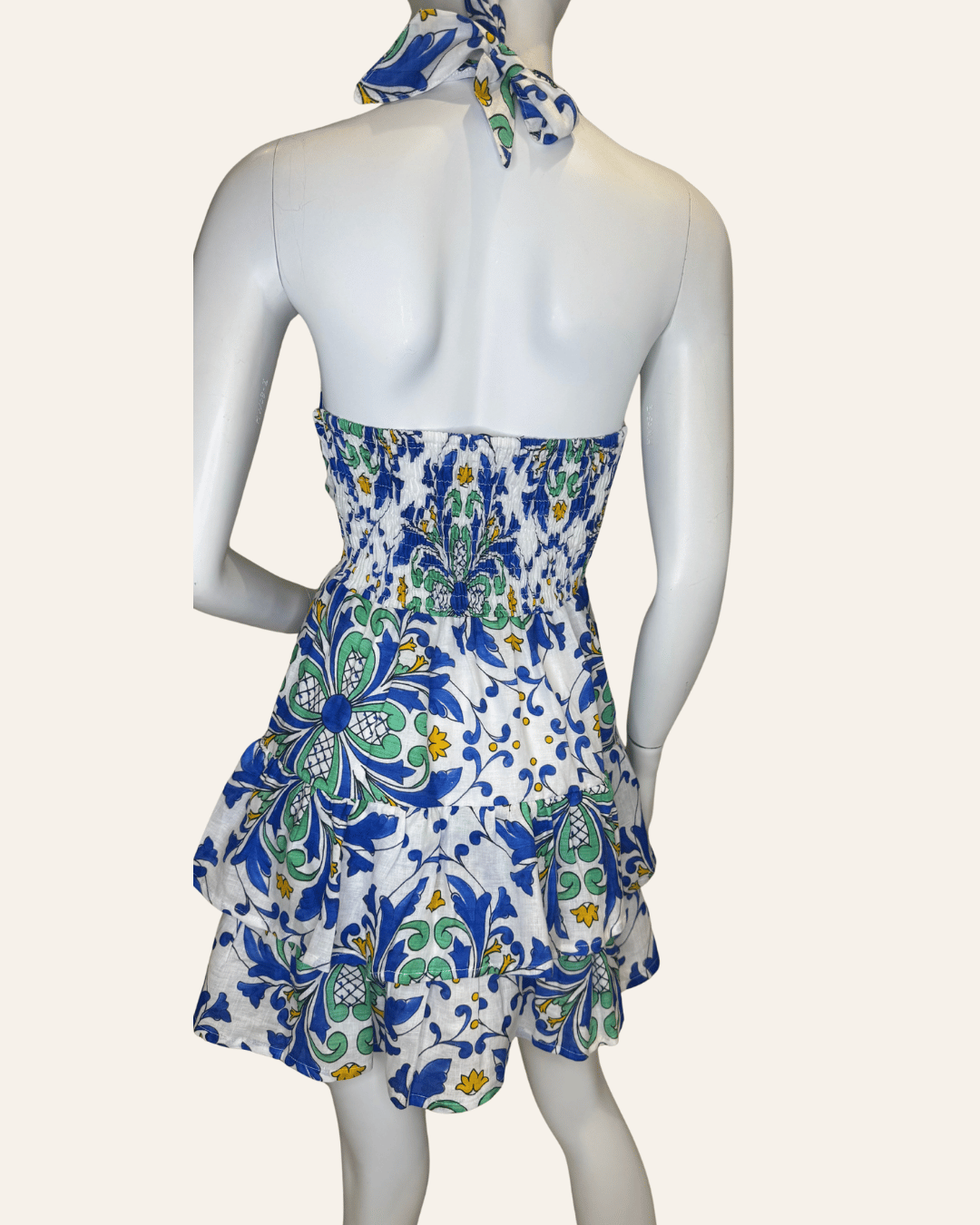 Il motivo dell’abito è tipica ed intramontabile maiolica di Vietri nelle sfumature del mare.