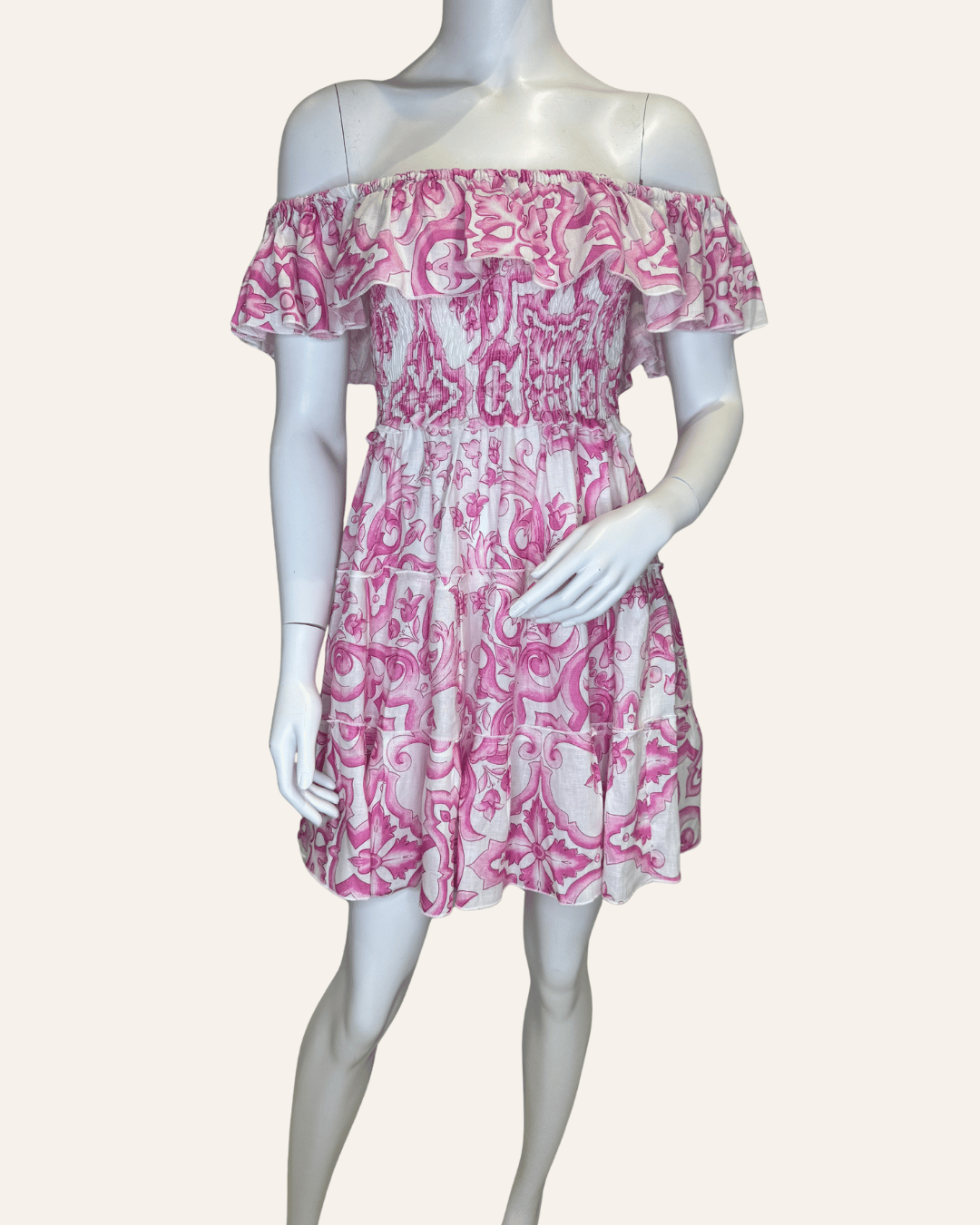 Abito in lino, modello corto sopra il ginocchio, con comodo elastico in vita, spalle scoperte e bretelle da portare alte o basse fru fru.