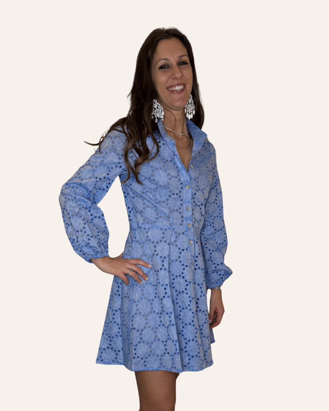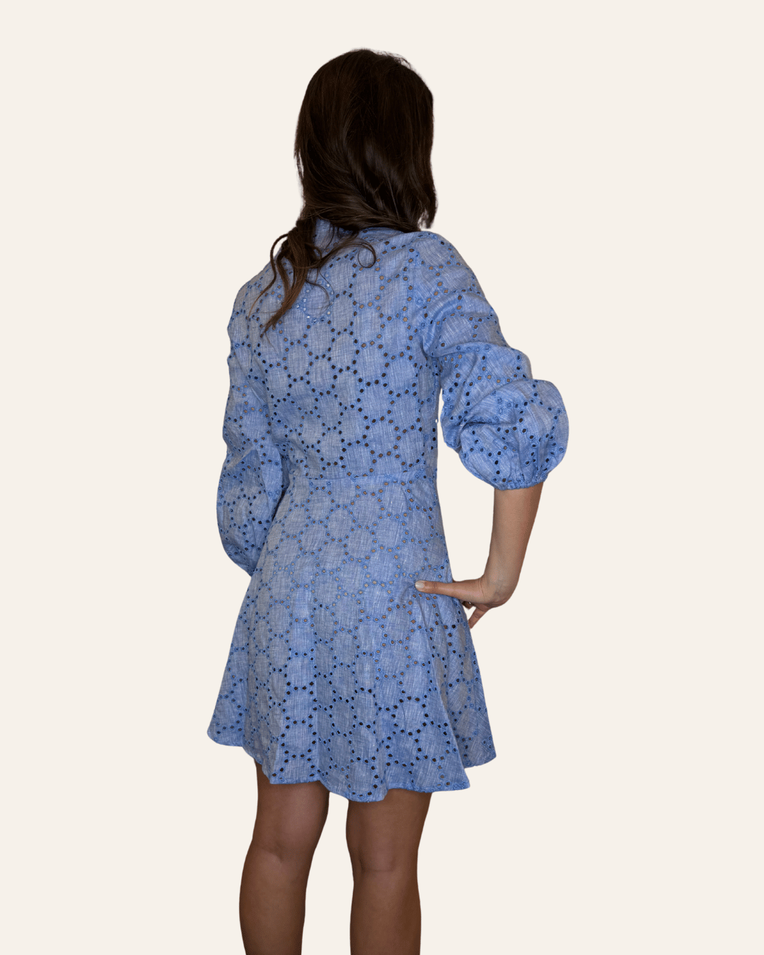 Vestito donna in lino della collezione Sangallo Balloon in un delicato colore azzurro, con manica a palloncino e collo coreana, bottoni madreperla. Modello stretto e sfiancato in vita con gonna ampia, lunghezza corta (sopra il ginocchio).