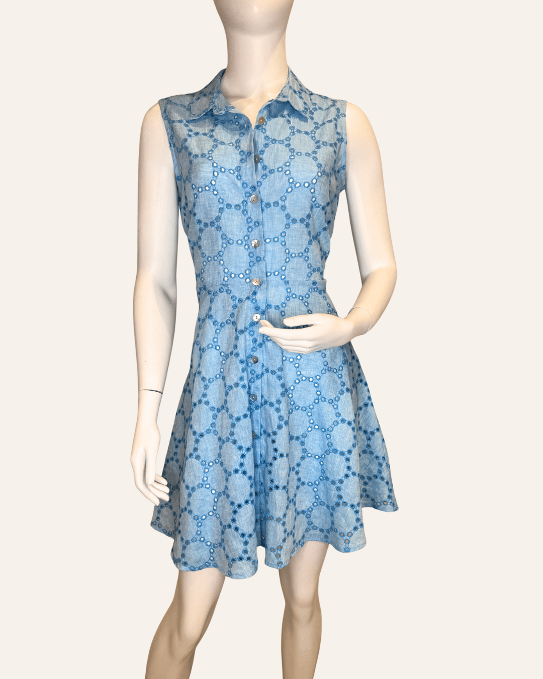Vestito donna in lino della collezione Sangallo in un delicato colore azzurro Niagara, abito senza manica con collo francese, bottoni madreperla. Modello stretto e sfiancato in vita con gonna ampia, lunghezza corta (sopra il ginocchio).
