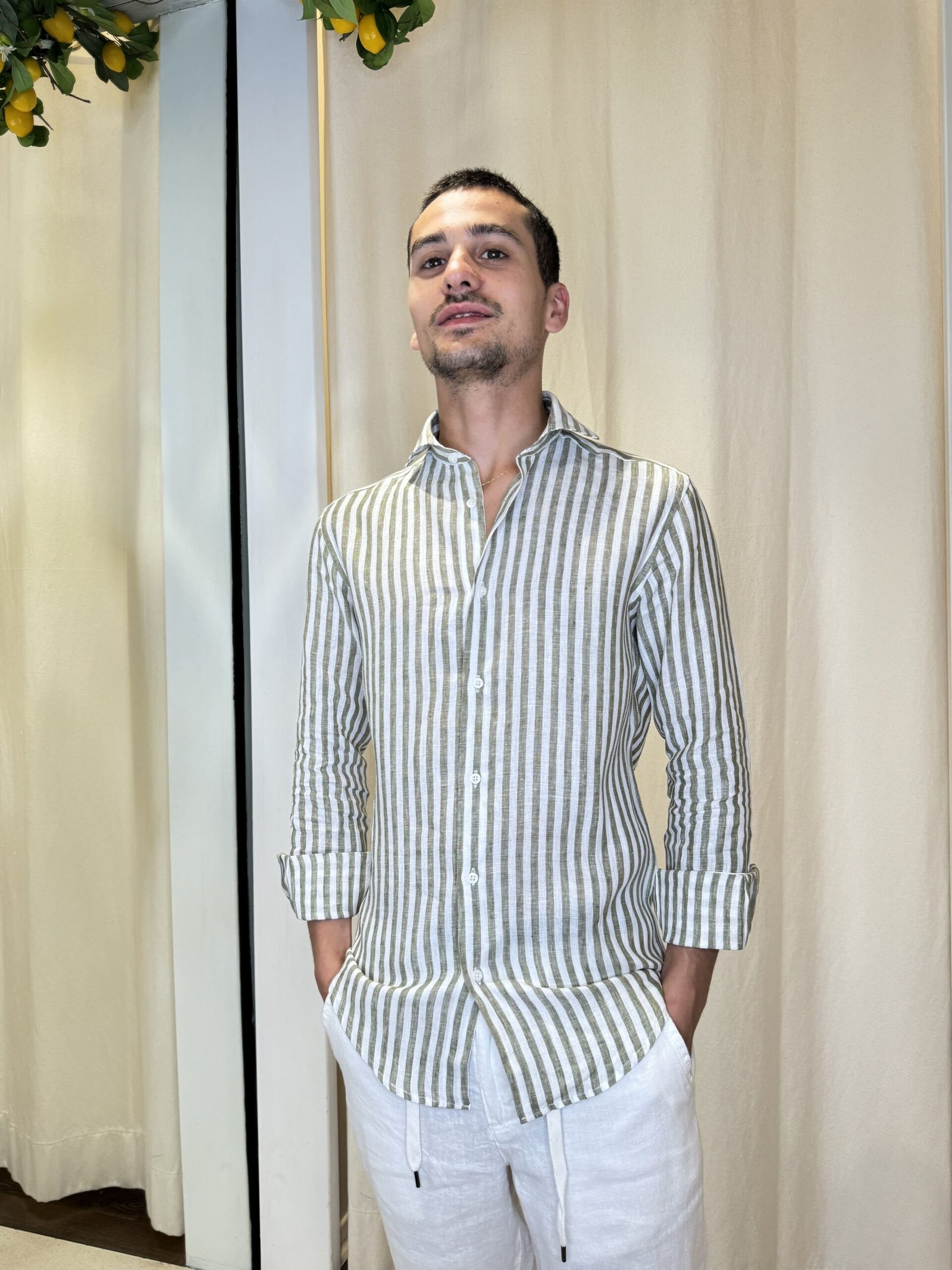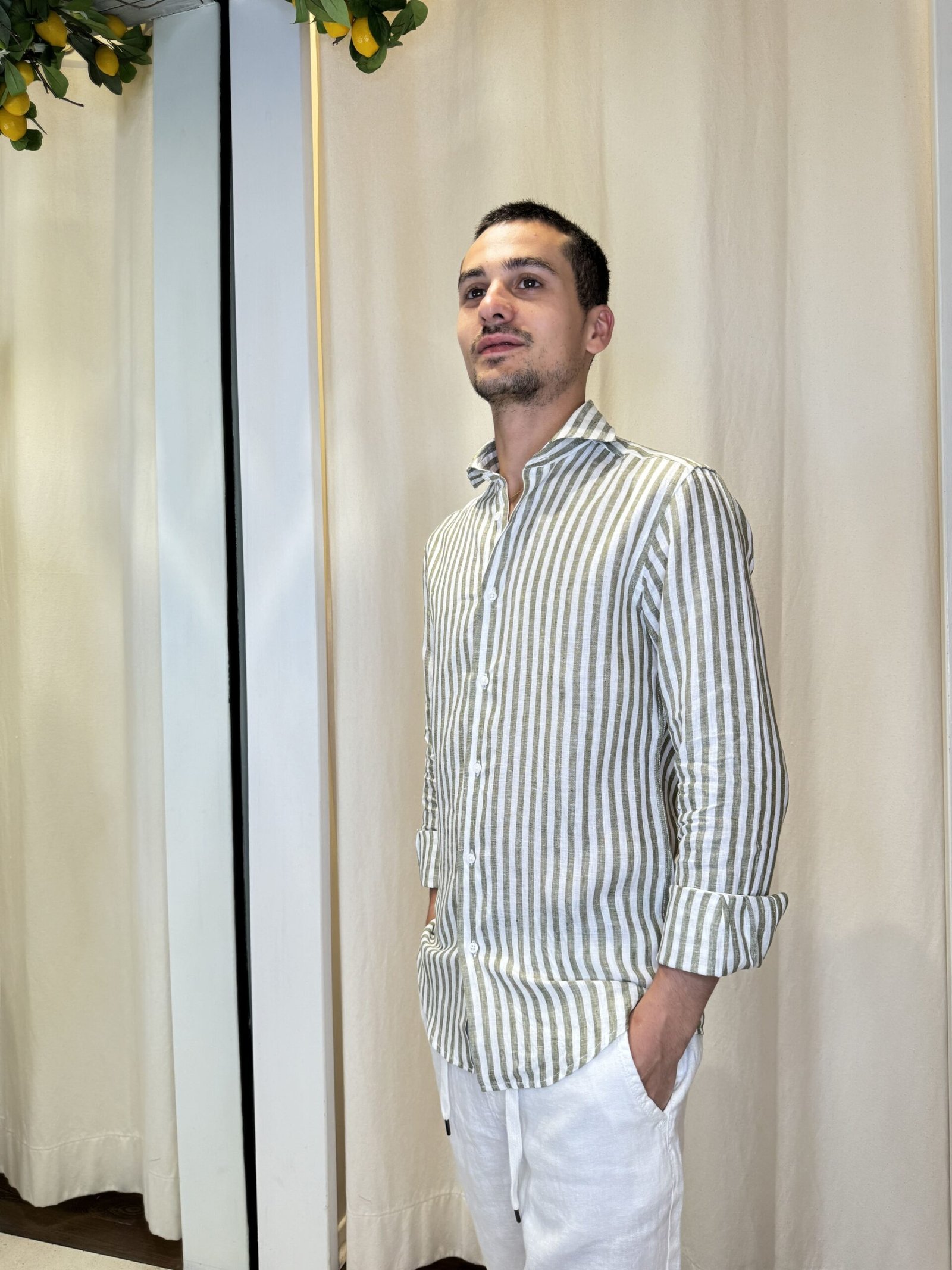 Camicia elegante a righe color verde a maniche lunghe (regolabili) e collo francese.