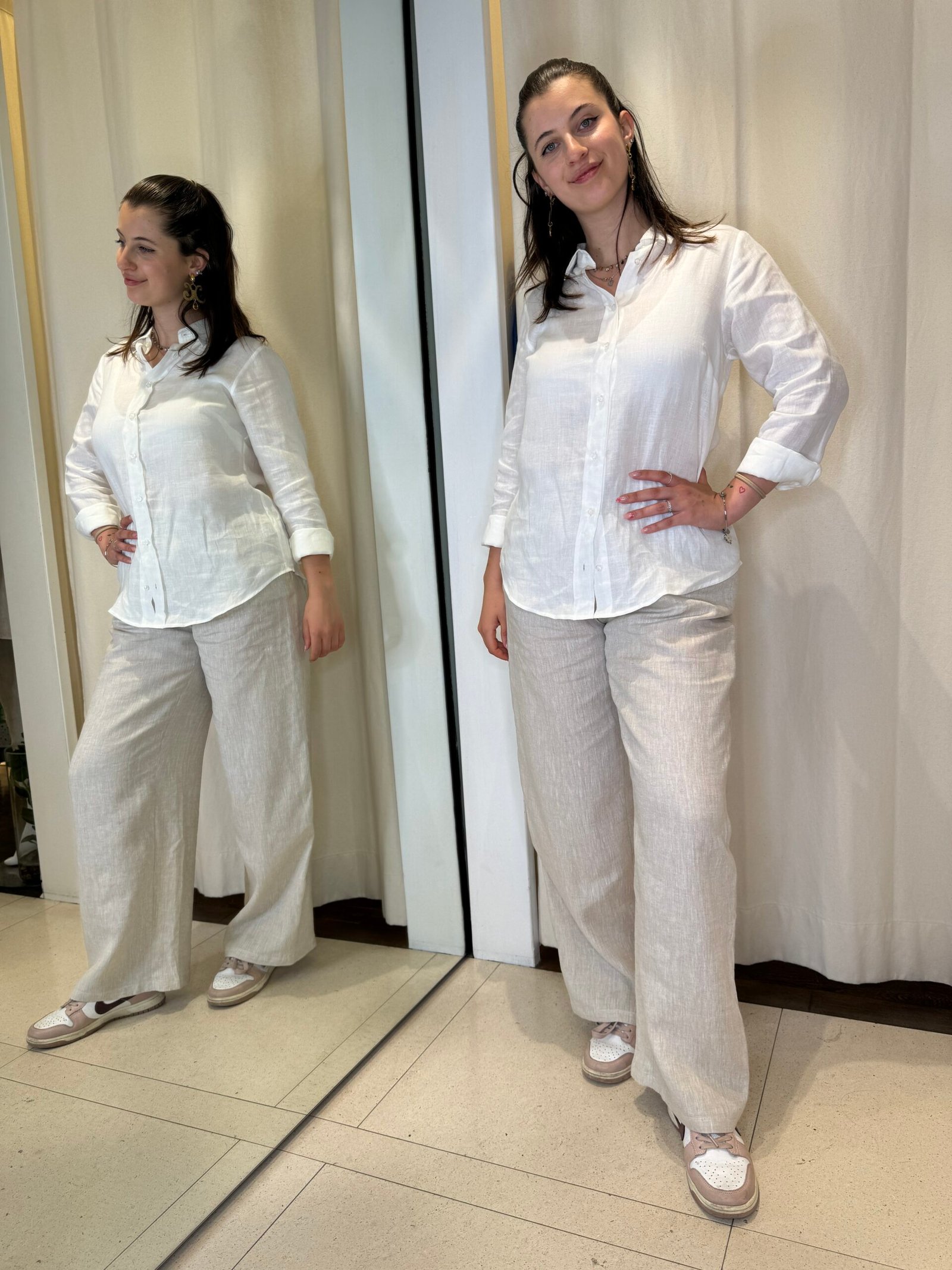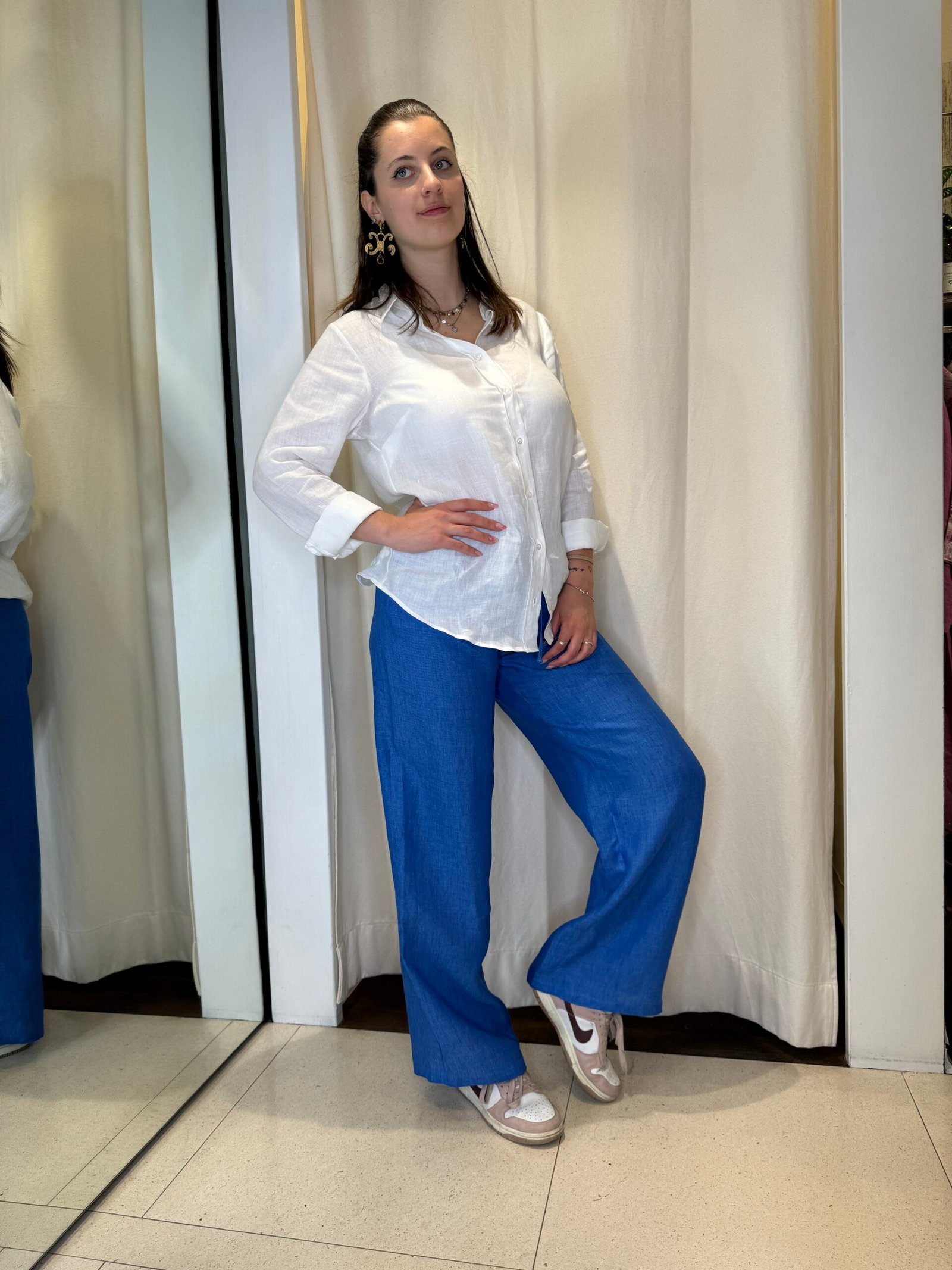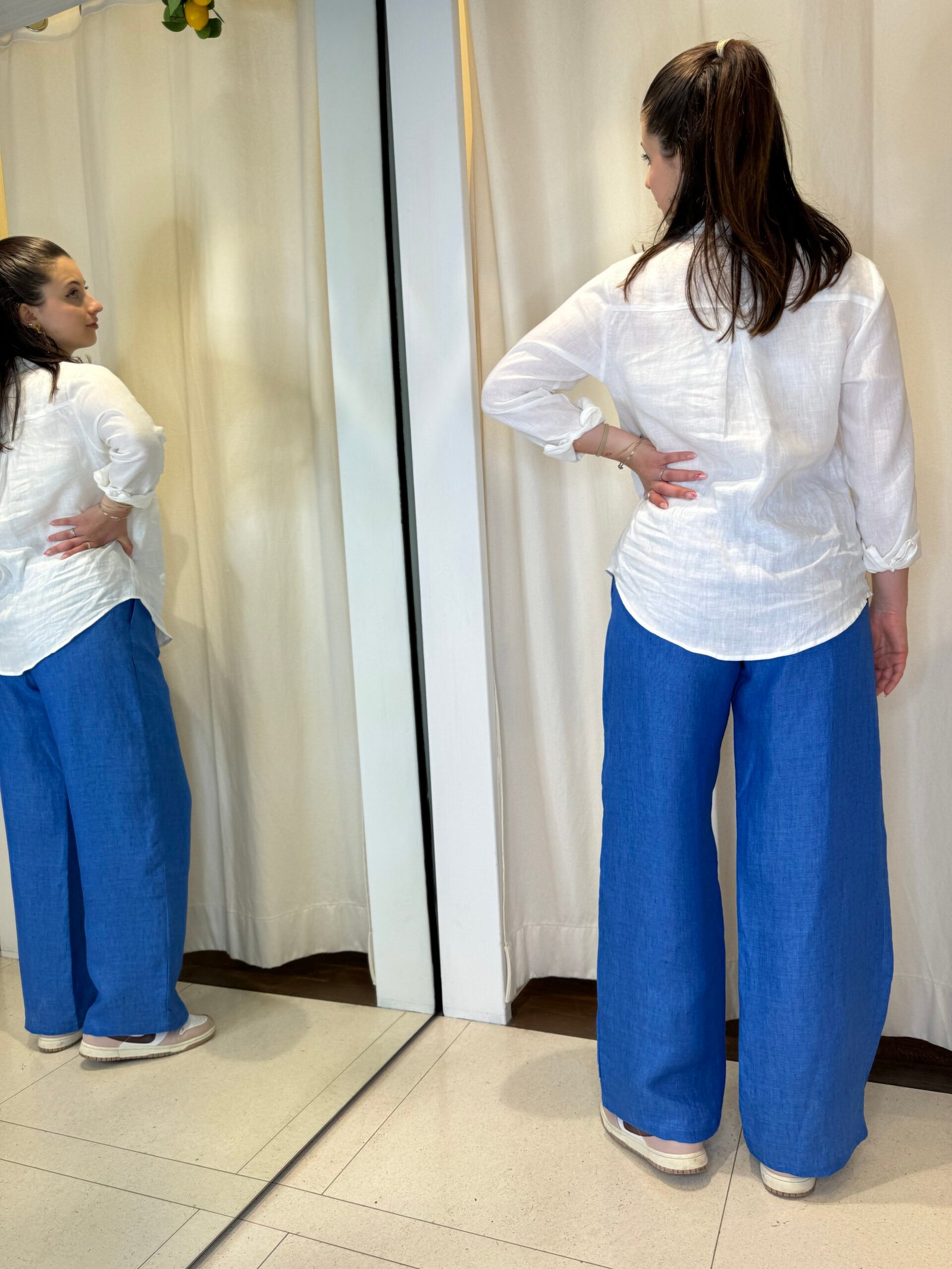 Consigliamo di abbinare la camicia bianca con i nostri panta-laccio o shorts in lino color écru oppure blu royal.