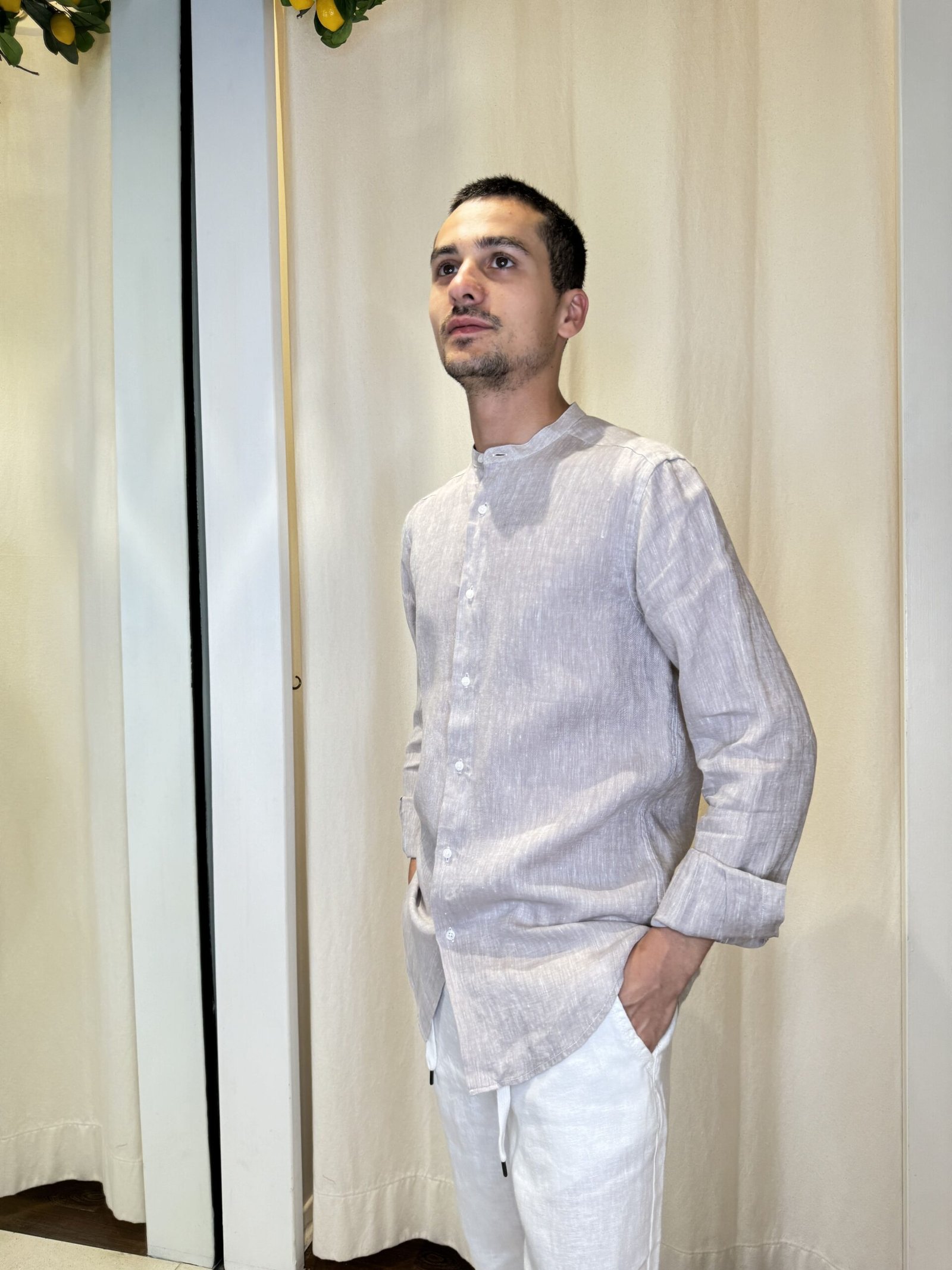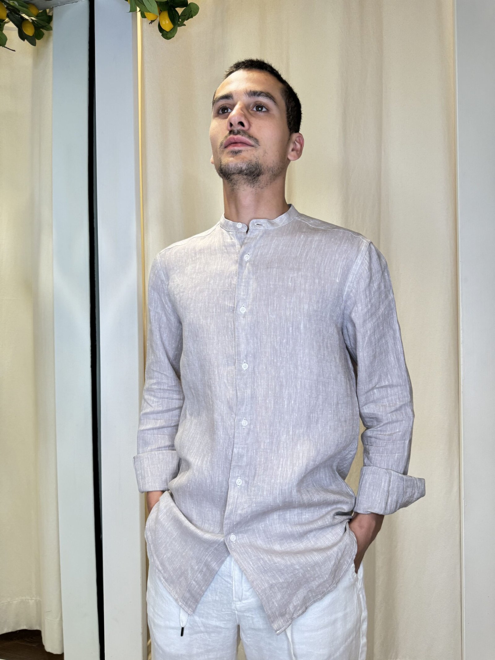 Camicia elegante color ecru’ a maniche lunghe (regolabili) e collo coreano.